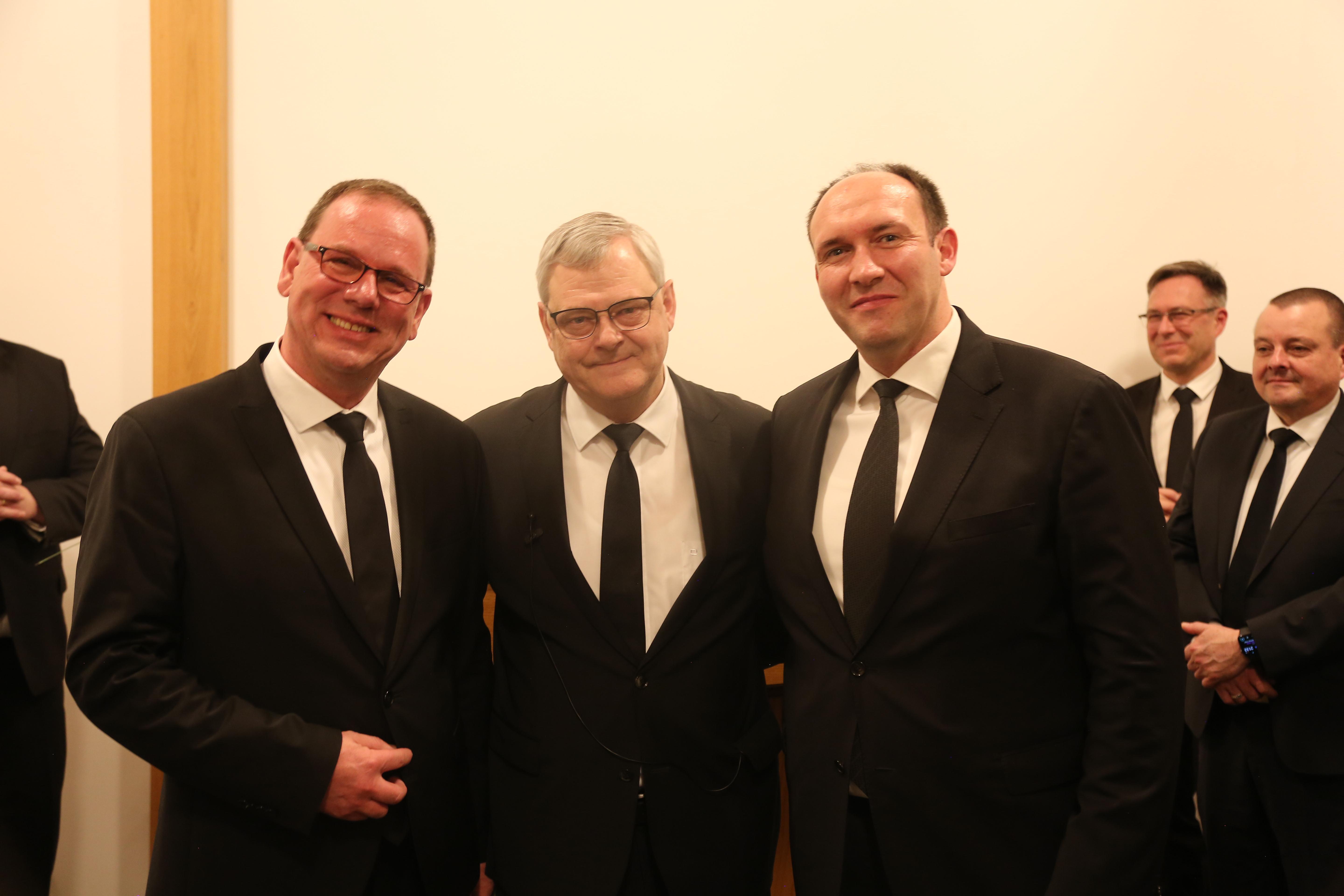 Apostel Ralph Wittich, BÄ.i.R. Holger Niebhagen; neuer Bezirksvorsteher Heiko Born; Im Hintergrund Bischof Mike Dietel
