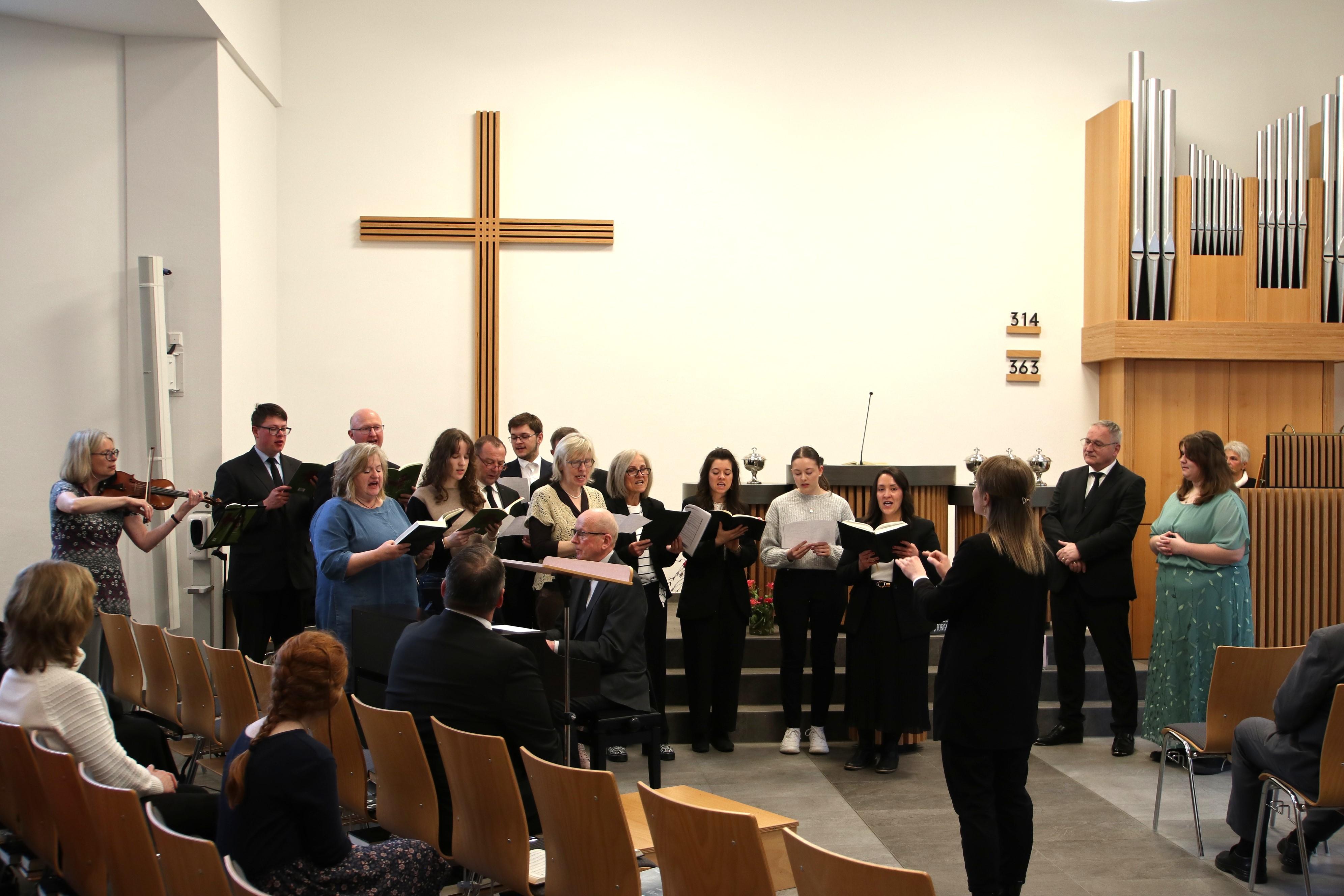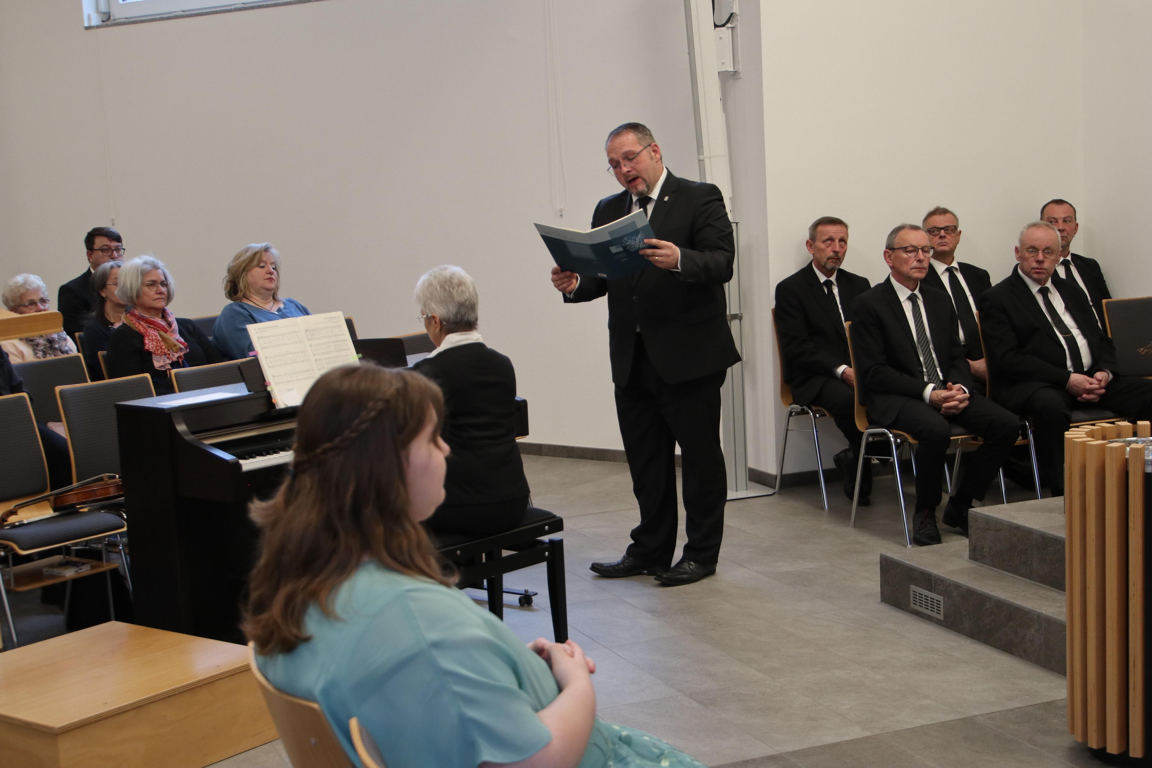Eine ihrer bisherigen Begleiterinnen, die Vorsonntagsschullehrerin und Diakonin Therasa Buchold verglich in ihrem Predigtbeitrag die Beziehung zu Gott mit einem Faden, der nicht zerrissen werden kann. Diakon Paul Rüdiger ergänzte, dass Gott die Hand nach jedem Menschen ausstreckt und dass wir nur zuzugreifen brauchen. Zwischen den Predigtbeiträgen trug der Chor zum Anlass passende Lieder vor, wie zum Beispiel „Jesus, bleib in meinem Leben, Weggefährte, bester Freund“.