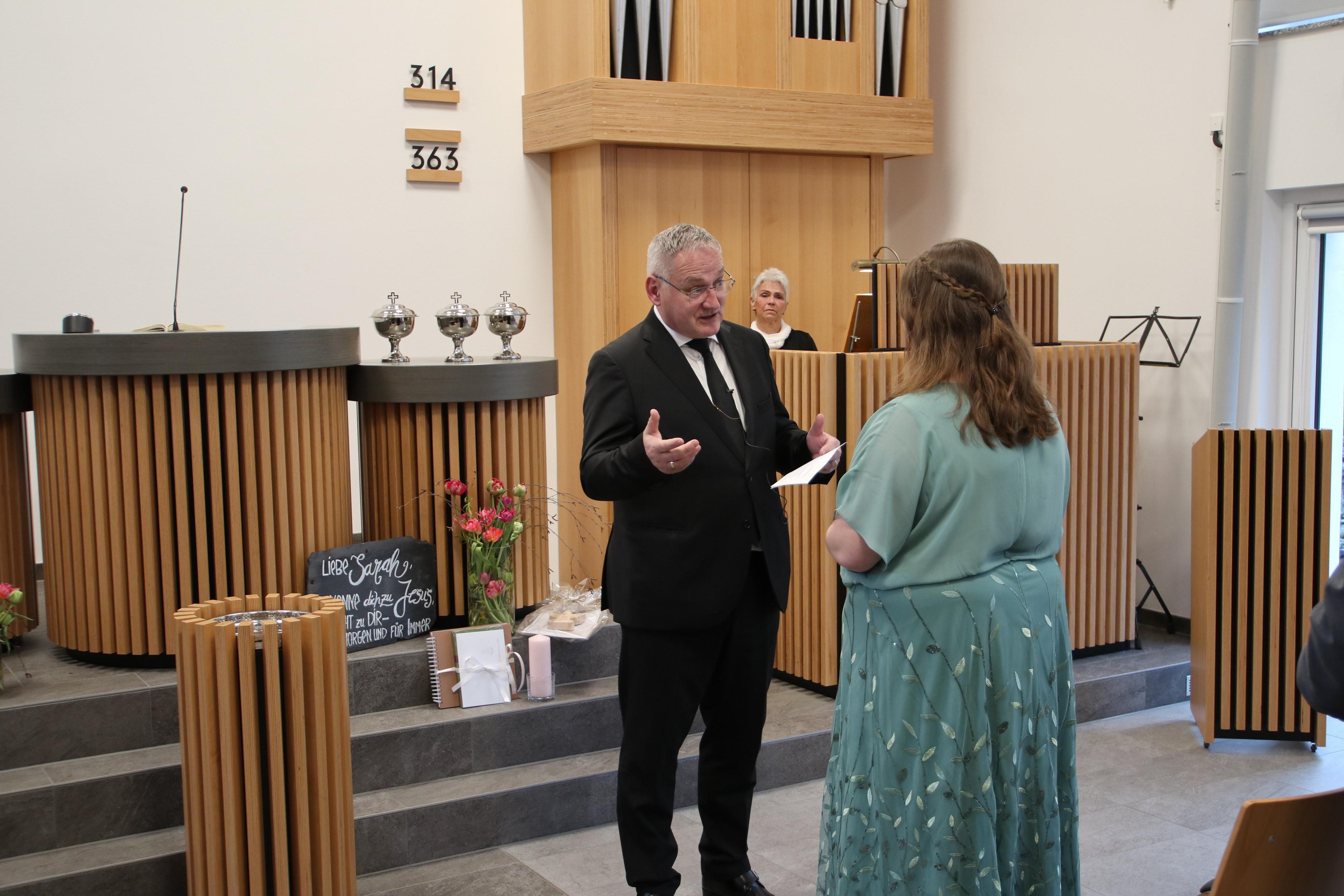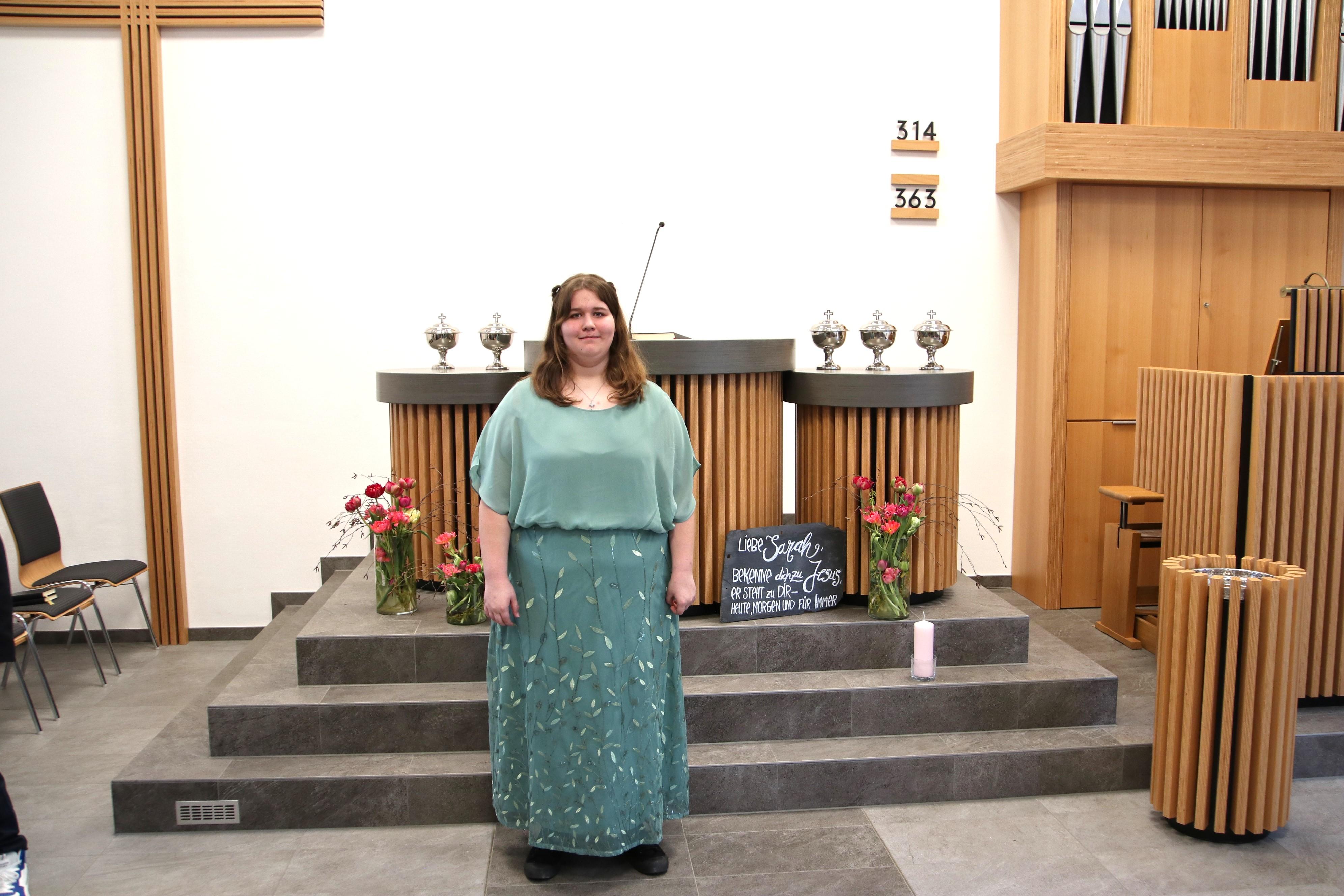 Anschließend sang ein Chor aus Jugendlichen, Jugendseelsorgern und Lehrkräften das Lied „Ins Wasser fällt ein Stein“ und begrüßte Sarah im Kreis der Jugend. Nach der Feier des Heiligen Abendsmals und Abschluss des Gottesdienstes bedachten viele der Anwesenden die junge Glaubensschwester mit Glückwünschen und Geschenken.