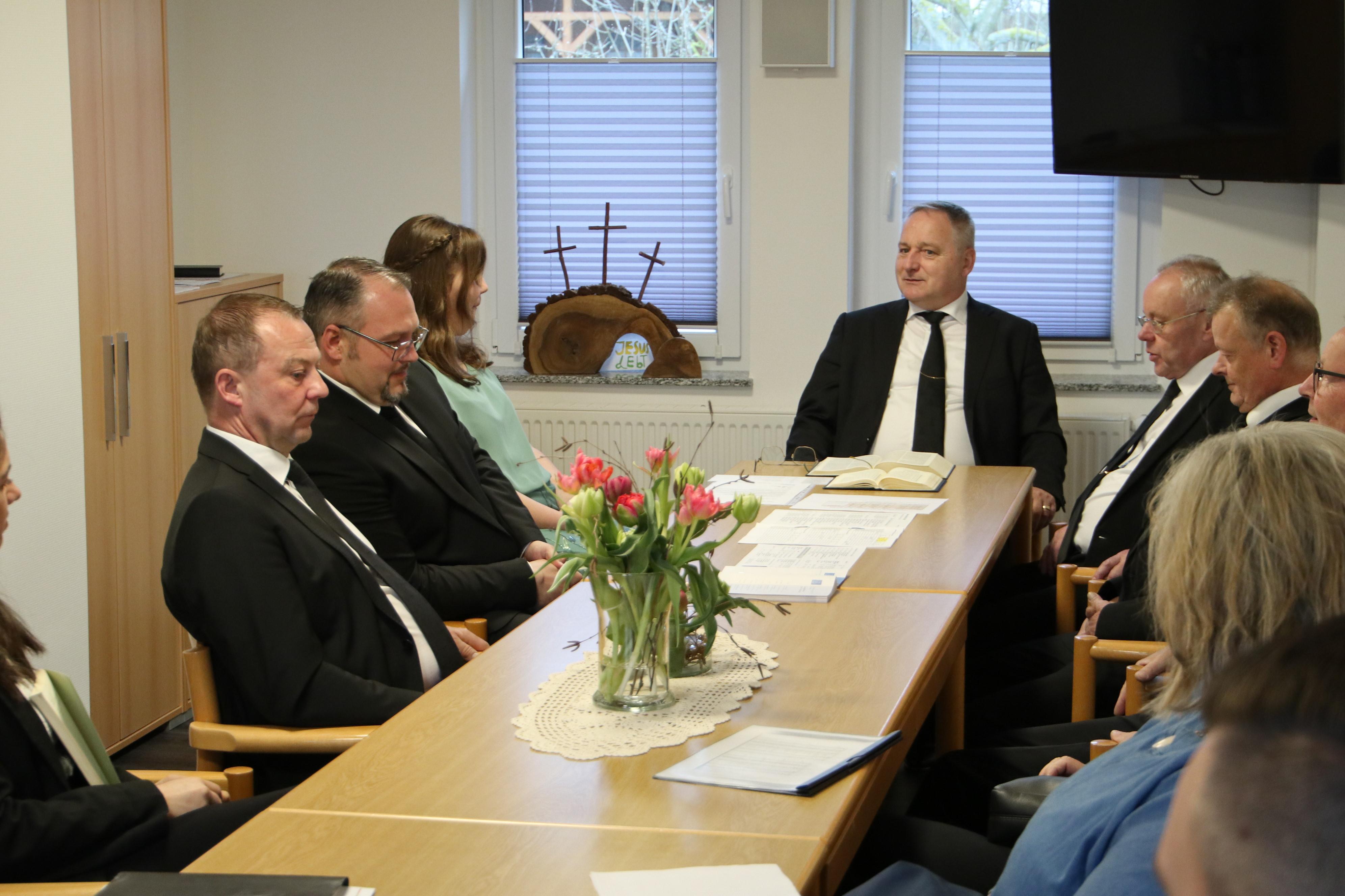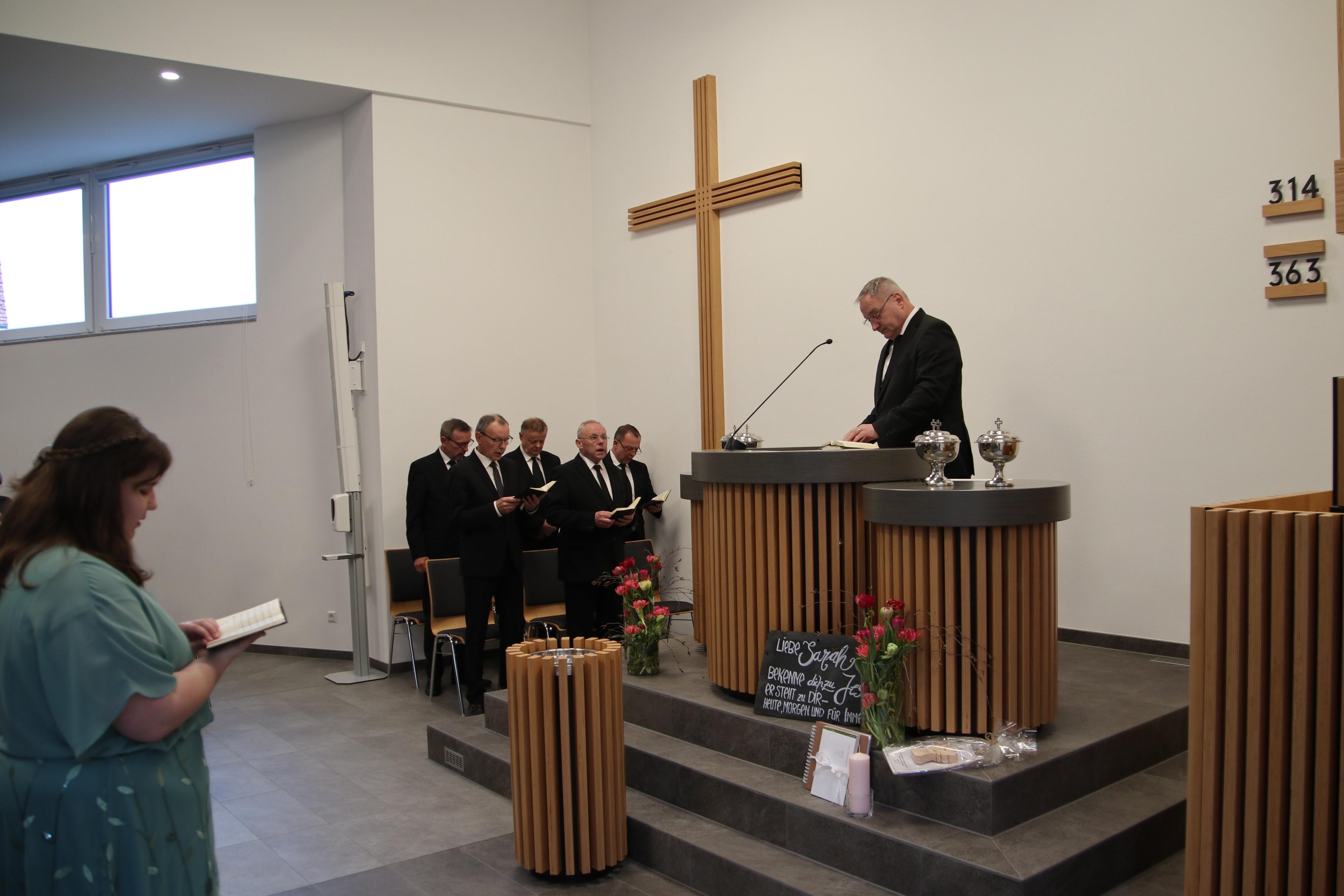 Eine ihrer bisherigen Begleiterinnen, die Vorsonntagsschullehrerin und Diakonin Therasa Buchold verglich in ihrem Predigtbeitrag die Beziehung zu Gott mit einem Faden, der nicht zerrissen werden kann. Diakon Paul Rüdiger ergänzte, dass Gott die Hand nach jedem Menschen ausstreckt und dass wir nur zuzugreifen brauchen. Zwischen den Predigtbeiträgen trug der Chor zum Anlass passende Lieder vor, wie zum Beispiel „Jesus, bleib in meinem Leben, Weggefährte, bester Freund“.