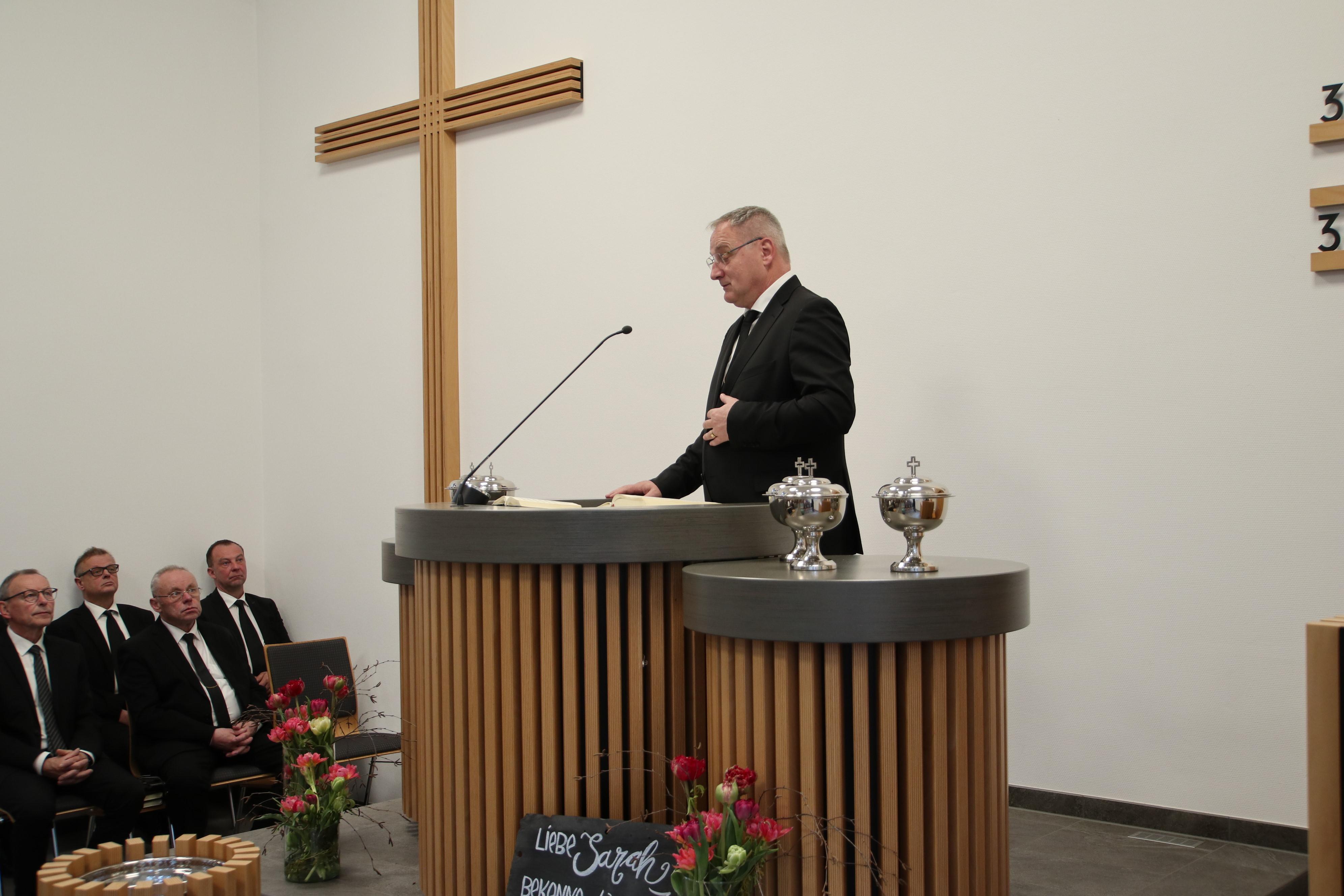 Mit dem Bibelwort aus Matthäus 10, 32 leitete Priester Ingo Karth den Konfirmationsgottesdienst. Der langjährige Jugendseelsorger hob in seiner Predigt hervor, dass die Konfirmation für jedes Gotteskind ein herausragender Tag sei und nicht nur aus Tradition gefeiert werden dürfe. Die Konfirmandin habe sich bewusst für den Weg mit Jesus entschieden und die ganze Gemeinde möge sie auf diesem Weg begleiten.